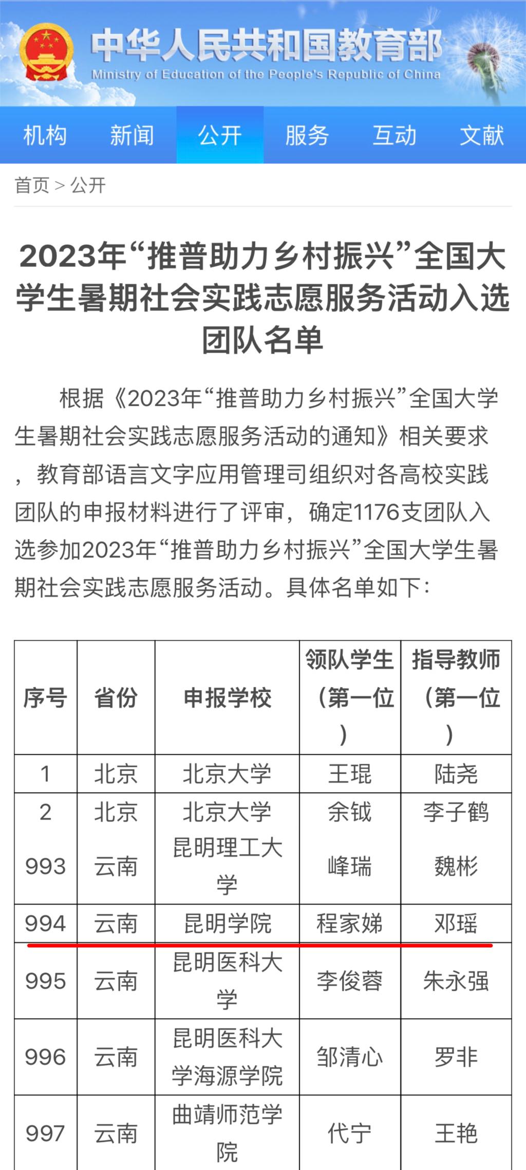 近日,教育部官网公布了2023年“推普助力乡村振兴”全国大学生暑期社会实践志愿服务活动入选团队名单,永利官网省级国家通用语言文字推广基地项目执行负责人邓瑶教授带队指导的“yl23411永利集团官网赴西双版纳勐遮镇推普助力乡村振兴服务队”成为永利官网唯一入选团队。该项活动由教育部语用司联合团中央青年发展部共同举办,旨在深入学习贯彻落实党的二十大精神,加大国家通用语言文字推广力度,服务铸牢中华民族共同体意识。