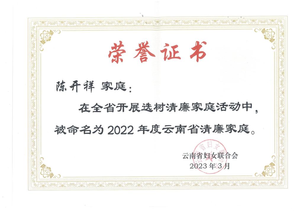 近日,云南省妇联开展的2022年云南省清廉家庭选树活动结果揭晓,永利官网陈开祥家庭荣获云南省“清廉家庭”称号。