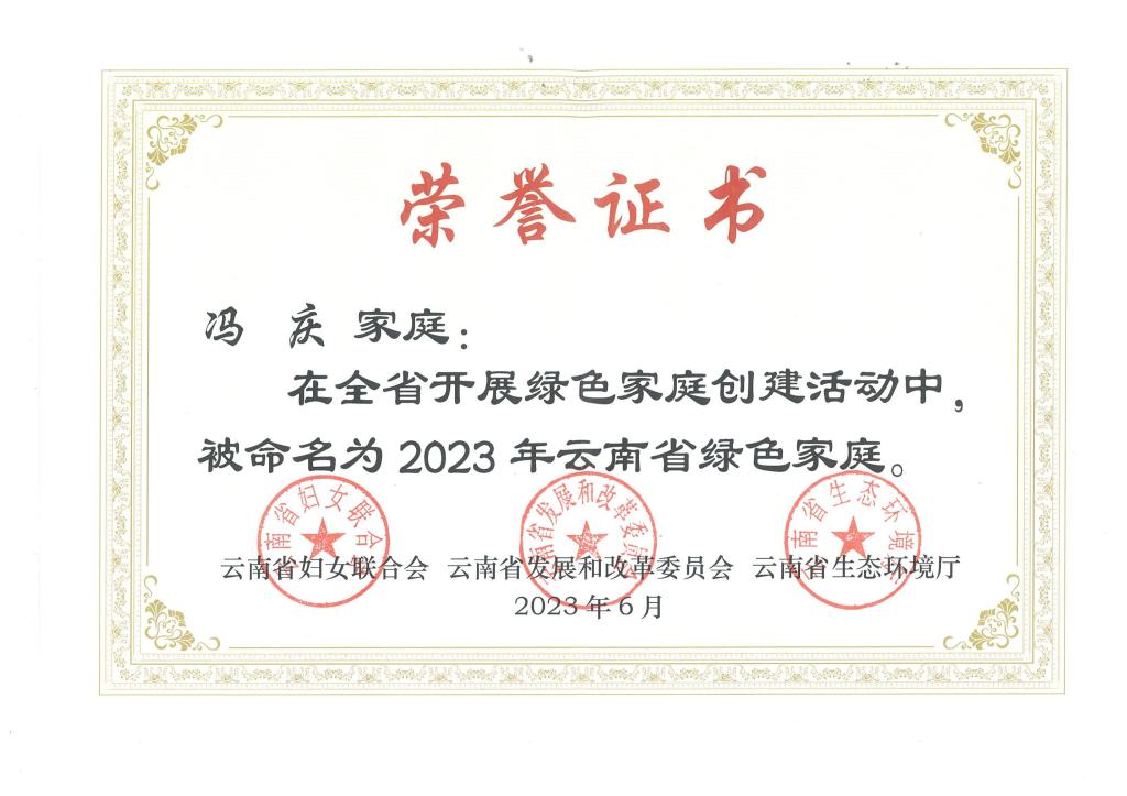 近日,云南省妇联、省发展改革委、省生态环境厅联合开展的2023年云南省绿色家庭创建示范活动结果揭晓,永利官网教师冯庆家庭荣获云南省“绿色家庭”称号。