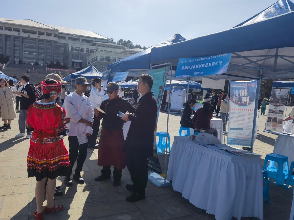 为拓宽旅游学院毕业生就业渠道,搭建用人单位与毕业生交流平台,促进毕业生充分高质量就业,1月5日下午,旅游学院在聂耳广场举办2024年大学生就业专场招聘会。副校长王凡、招生就业处负责人到场指导,与用人单位深入接洽。旅游学院党政领导班子、全体教师、全体2024届毕业生及其他年级学生参加本次招聘会。