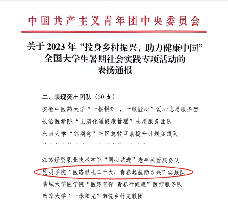 近日,共青团中央青年发展部发布了《关于2023年“投身乡村振兴,助力健康中国”全国大学生暑期社会实践专项活动的表扬通报》,对在活动中为建设健康中国、投身乡村振兴作出积极贡献、表现突出的实践单位、团队和个人进行表扬。yl23411永利集团官网“医路献礼二十大,青春起航助乡兴”实践队凭借其在实践活动中的卓越表现,成功入选“表现突出团队”名单。