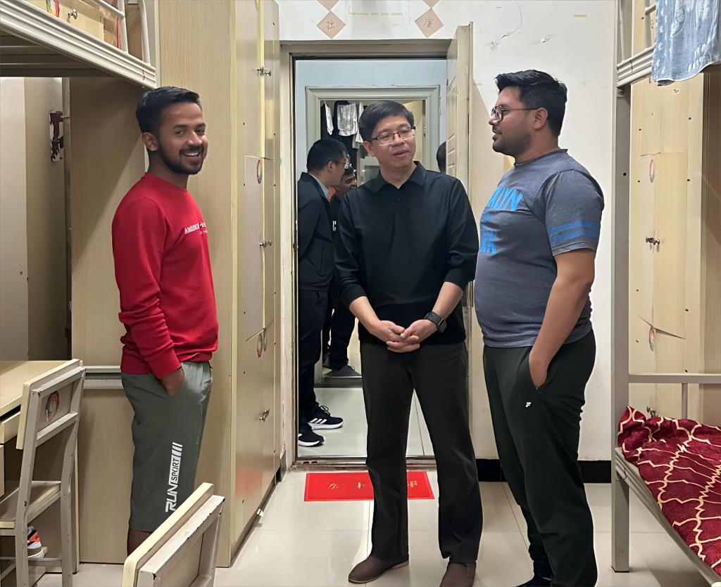 4月23日,党委委员、副校长李剀到学生宿舍看望留学生,与留学生亲切交谈,详细了解同学们思想、学业、生活等方面的情况。