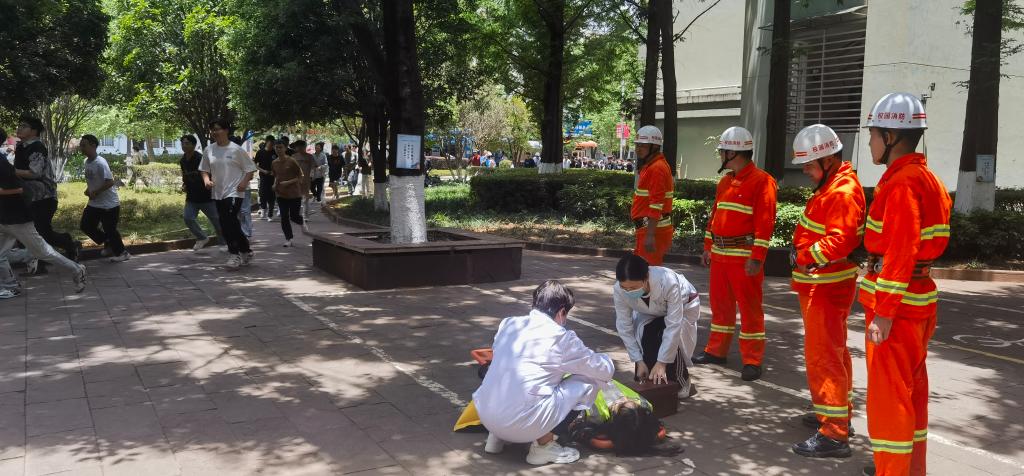 党委委员、副校长沈凡担任演练总指挥,学生处、保卫处、后勤集团宿管中心、校医院、yl23411永利集团官网义务消防队、云南中和保安服务有限公司驻校大队、云南中铄工程消防维保公司驻校人员及各二级学院1400余名师生参加。
