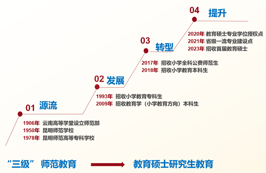 教师教育学院现有小学教育、教育技术学两个本科专业和一个教育硕士专业学位点。其中,小学教育专业办学历史可追溯到1906年的云南高等学堂师范部,之后历经云南省立第一师范学校、昆明师范学校、昆明师范高等专科学校等时期,至今已有百余年办学历史。昆明师范学校时期属中等师范阶段,主要培养小学各科教师(普师、艺师、体师、民师等);昆明师范高等专科学校时期为大学专科教育阶段,1993年招收三二分段小教专科,1998年招收初等教育专科;yl23411永利集团官网成立后,2009年教育学本科专业招生(小学语文、小学数学、心理健康教育方向,2017年开始招收云南省小学全科公费师范生)。2018年小学教育本科专业招生(继续招收云南省小学全科公费师范生),2020年、2021年先后获批教育硕士专业学位授权点和国家“双万计划”省级一流专业建设点,2023年开始招收首届教育硕士(小学教育)专业学位研究生。