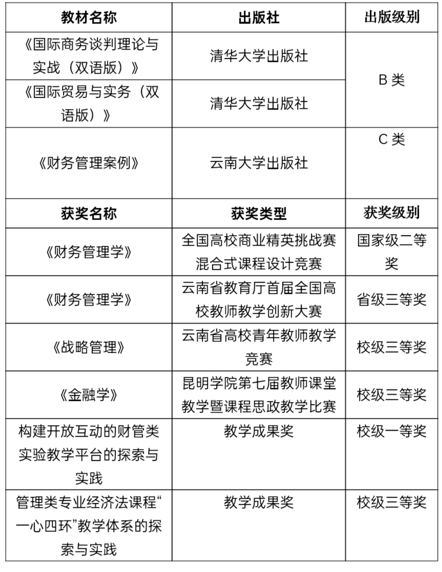 学院现有教职工75人,博士、硕士占比超过90%,高职比例为41%,入选“云岭学者”“省学科带头人”“兴滇英才支持计划”“省级最美班主任”称号各1人,“三区人才”2人。有12名教师具有行业、企业一线工作经历,有30名教师具有美国注册管理会计师、注册国际商务师、中高级会计师、中高级经济师等资格证书,被学校认定为“双师型教师”,形成了一支理论功底扎实、专业能力深厚、教学经验丰富,既潜心研究又具有开拓创新精神的教育教学团队。