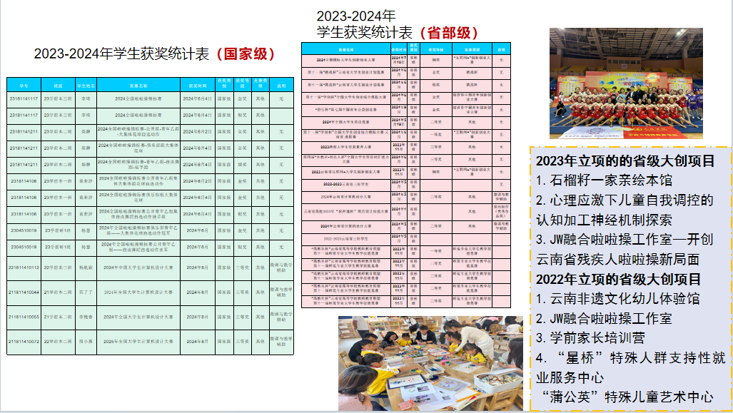 学院在课程建设、教材建设和教学研究方面取得了一系列成果,包括教学成果奖、省级一流本科课程、教学竞赛获奖、教改项目立项以及创新团队设立等。其中:学前教育专业与特殊教育专业共同完成的“政-校-园协同:特殊需要幼儿高质量学前融合教育模式构建与实施”获云南省教学成果奖(基础教育)一等奖,《幼儿园管理》立项省级一流本科课程,《学前教育原理》立项省级课程思政示范课程,《学前儿童心理学》获省赛二等奖,《“新师范”背景下“嵌入式” 课程思政模式创新及实践》获省级教改项目立项;世行项目案例2项入选全球减贫案例;《“校-园”协同,特殊幼儿学前融合教育实践与探索——yl23411永利集团官网附属幼儿园融合教育案例》入选首届全国特殊教育融合教育优秀教育教学案例;出版学前融合教育系列教材4本。