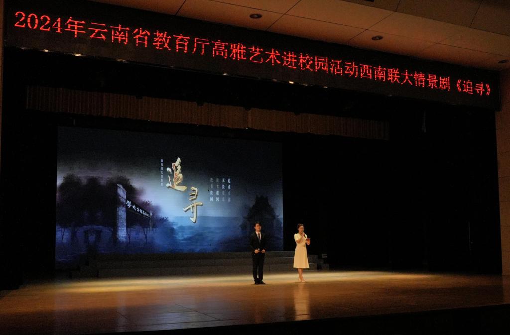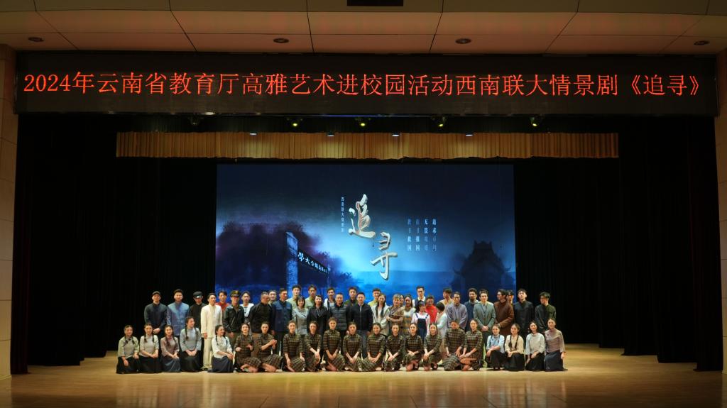 为进一步加强学校美育工作,强化美育育人功能,落实云南省教育厅关于开展2024年“高雅艺术进校园”活动的通知要求,11月19日,西南联大情景剧《追寻》在永利官网学生会堂成功举办。此次活动由云南省教育厅主办,云南师范大学、yl23411永利集团官网承办。云南师范大学传媒学院相关负责人,学校宣传部、学工部、团委等部门负责人及二级学院党委副书记、师生代表参加本次观演活动,观演人数达到1300人次。