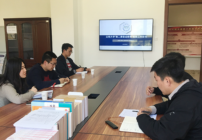 云南大学团委书记于春滨向永利官网调研人员介绍了云南大学开展第二课堂工作的基本情况和思路。他表示,学校领导重视,学校政策支持是第二课堂体系化常态化运行的重要保障, “第二课堂成绩单”已成为毕业生资格认定的标准之一。同时于书记从“到梦空间软件系统运用”、“打造第二课堂精品课程体系”、“加强第二课堂竞赛体系建设”、“第二课堂展示体验中心建设”等方面介绍了云大开展第二课堂的工作特色和经验。云大校团委王鹏飞对“第二课堂成绩单”制度建设、成绩管理认证、学分积分兑换标准、工作队伍的管理及培训等工作做了详细说明。双方人员也就“第二课堂”实施中的有关问题进行了交流。