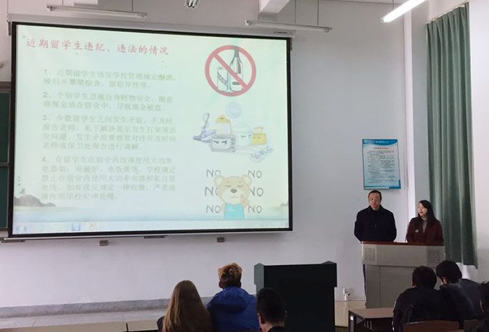 学校保卫处治安科科长张智益老师通过一组幻灯片生动形象地为留学生宣讲安全注意事项,提醒留学生一定要熟悉中国法律法规,留校期间要遵规守纪,提高安全意识,注意交通安全、用电安全,在校期间不得饮酒、酗酒,不得留宿异性或在异性宿舍留宿,不得从事或进行宗教活动及集会等。为使留学生更清楚地理解培训内容,国际学院蔡琳老师做了英文同步翻译。