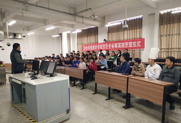 10月20日,yl23411永利集团官网旅游学院烹饪专业精英班开班仪式在烹饪实训中心举行,出席开班仪式的有旅游学院副院长吴跃辉、副院长杨韫、烹饪教研室主任孙志强、烹饪教研室副主任杨春雷,滇菜大师刘福灿及烹饪教研室彭彰智老师和经过层层筛选的40名烹饪与营养教育专业的精英班学生。开班仪式由孙志强主任主持。