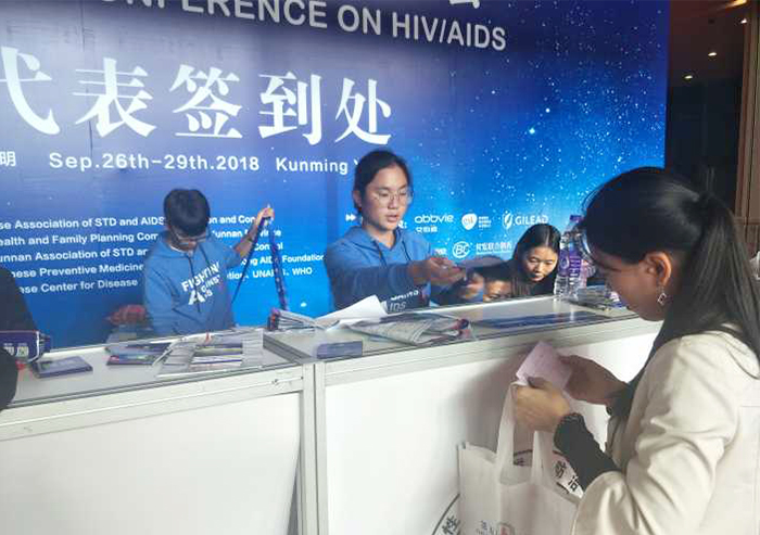 学术会期间,志愿服务工作有序展开,每天有40名志愿者上岗。根据大会需要,志愿者分为注册组、试片组、会务组等。志愿者们每天早上6:40集合出发,8:00准时到岗服务。注册组的志愿者有序地为参会嘉宾指引报到、网上注册、现场缴费、领取资料,志愿者同学们在人手紧张、工作任务繁重的情况下,在各自岗位上任劳任怨、辛勤工作,为来自国内外多学科领域的3000多名参会代表有序完成注册;试片组的志愿者在试片室为本次大会幻灯片放映工作提供保障,志愿者们为授课嘉宾打印资料、修改幻灯片格式并上传到大会的幻灯片放映系统中,4天累计上传课件300余份;会务组的志愿者分布在各个会场主要负责讲者们的课件正常播放及处理会场里的突发情况,协调艾协的工作人员、主持人、讲者的工作有条进行, 4天累计服务会议近30场,使学术大会按预期进行。9月29日在中国性病艾滋病防治协会全体工作人员的努力以及全体志愿者的协助下,大会圆满结束。