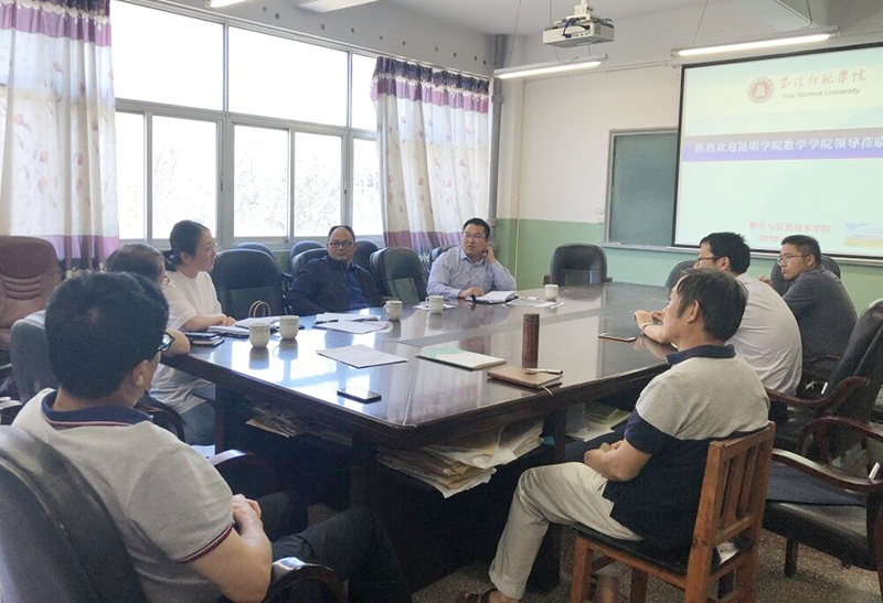 5月8日,学习考察组一行5人赴玉溪师范学院就师范专业认证的前期准备工作进行学习。玉溪师范学院数学与应用数学专业(初中数学)是云南省开展师范认证的5个试点专业之一,该专业所在的数学与计算机科学学院自2018年6月启动认证申请、数据填报及自评报告撰写等相关工作。数学与计算机科学学院刘云院长就师范认证的准备工作、培养方案的编制工作及自评报告的撰写工作依次进行了详细的介绍,强调了师范专业认证自评报告中应重点把握的几个关键点,并对数据填报中存在的困惑和遇到的困难进行了细致的讲解,希望在进一步的工作中和yl23411永利集团官网一起交流和共同探讨。