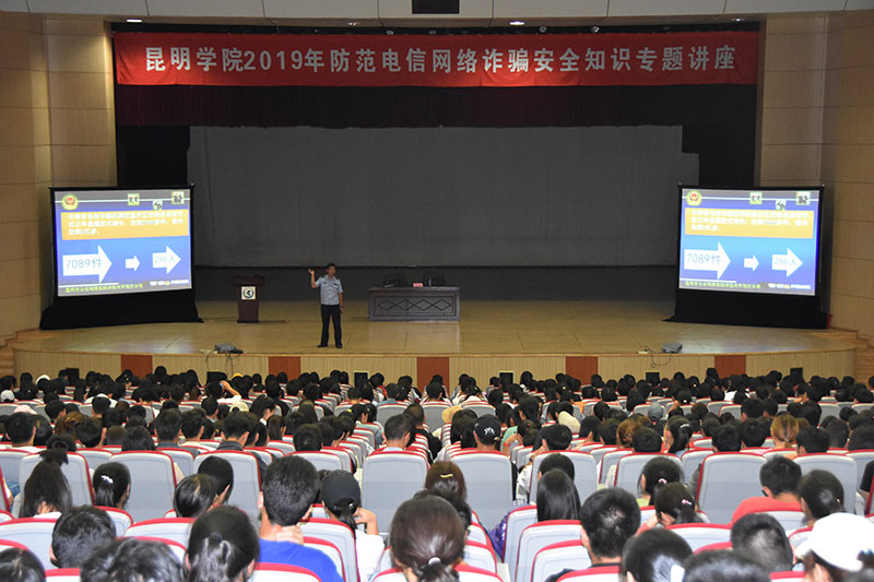 9月1日下午,学生处、保卫处联合举办“yl23411永利集团官网2019年电信网络诈骗安全知识专题讲座”。讲座邀请昆明市公安局国家经济技术开发区分局法制办警官闫文赋主讲,旅游学院、经济学院、城建学院2019级1300余名新生参加讲座,讲座由保卫处喻玲老师主持。
