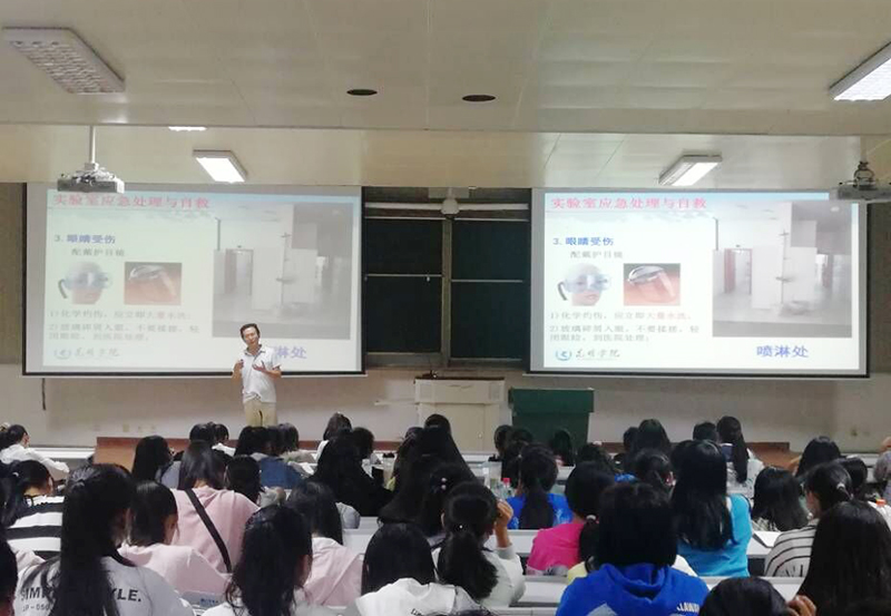 化学化工学院于9月3日到9月5日面向学院2019级入学新生开设《实验室安全及管理》课程,举办了三次化学实验室安全教育讲座,由化学化工学院实验中心黄文忠、鞠海东、梁德强三位经验丰富的老师进行讲解,新生对进入实验室前的实验安全进行了系统性学习:化学实验安全操作要求、危险化学品分类及使用中的注意事项、实验室消防安全及实验室应急处理与自救方法等。