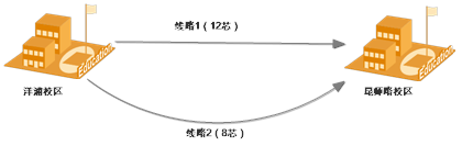 1、洋浦校区至昆师路校区采用一主一备(2条裸纤,要求走不同的市政道路)的方案,在负载均衡的同时兼有链路备份的功能。其中主链路要求12芯光纤,次链路要求8芯光纤;