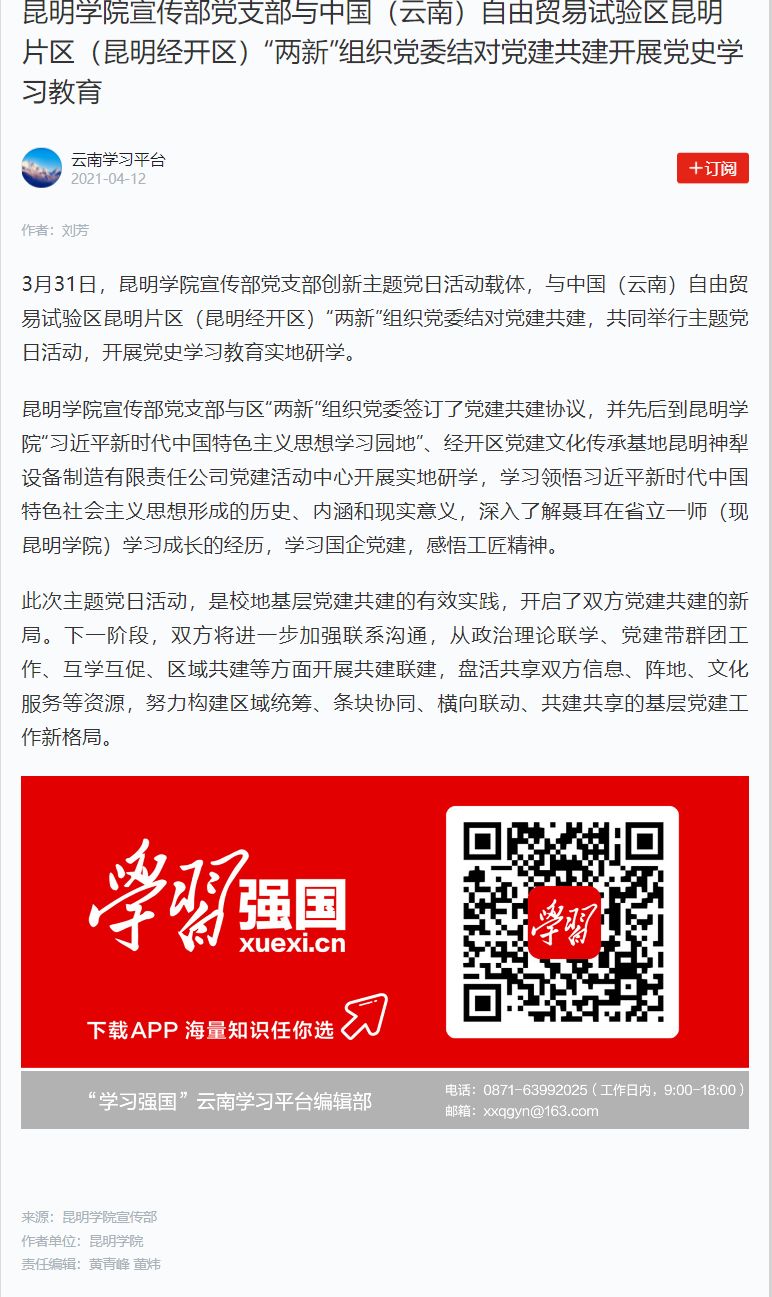 yl23411永利集团官网宣传部党支部与中国(云南)自由贸易试验区昆明片区(昆明经开区)“两新”组织党委结对党建共建开展党史学习教育