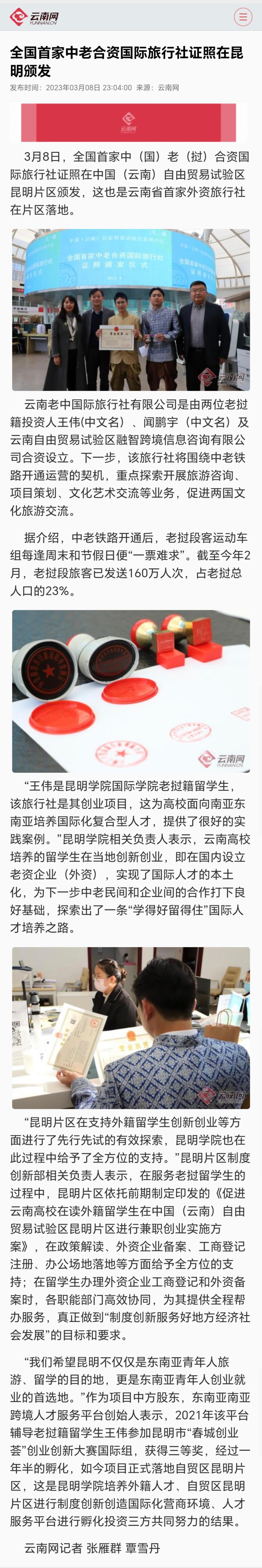 全国首家中老合资国际旅行社证照在昆明颁发