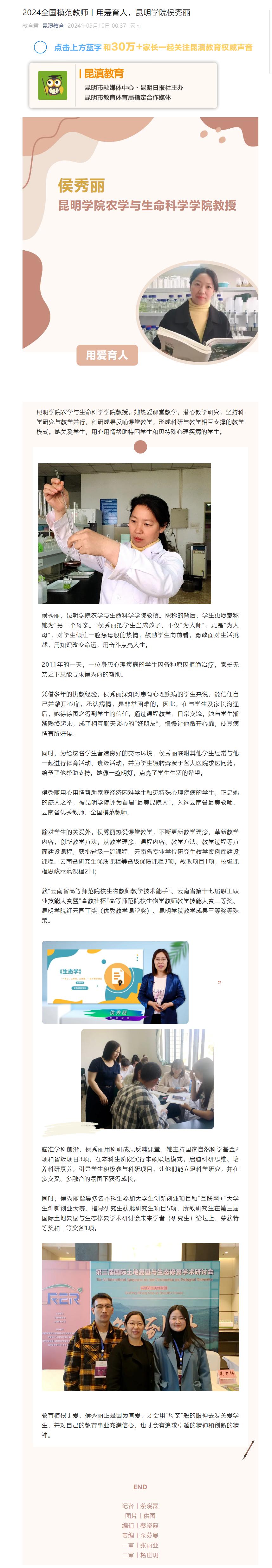 2024全国模范教师丨用爱育人,yl23411永利集团官网侯秀丽