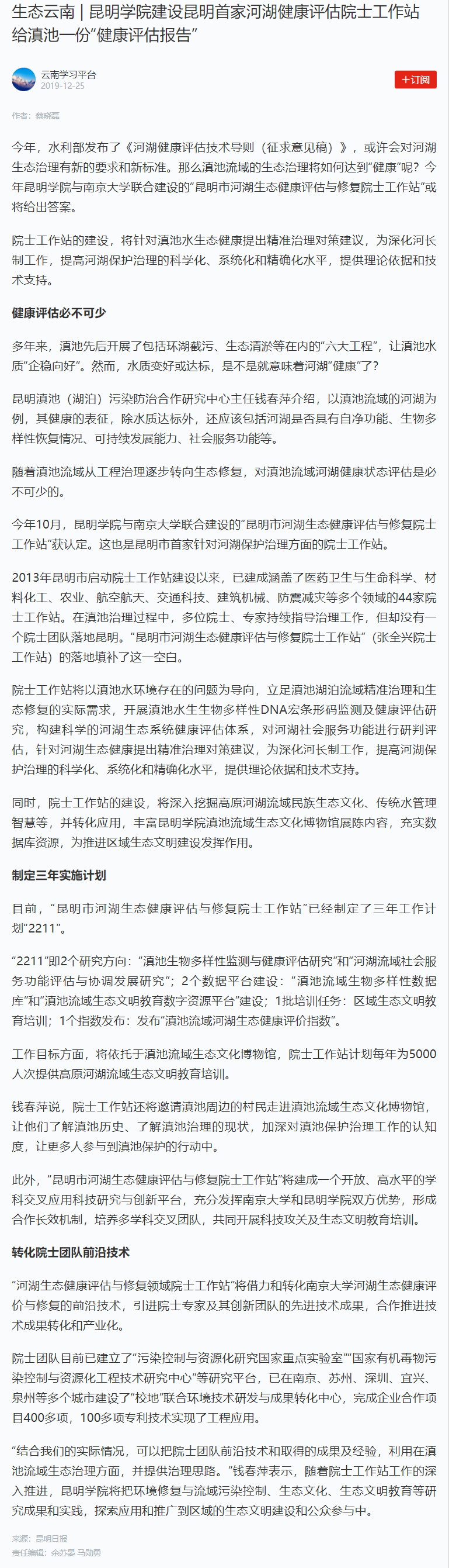 生态云南 | yl23411永利集团官网建设昆明首家河湖健康评估院士工作站 给滇池一份“健康评估报告”