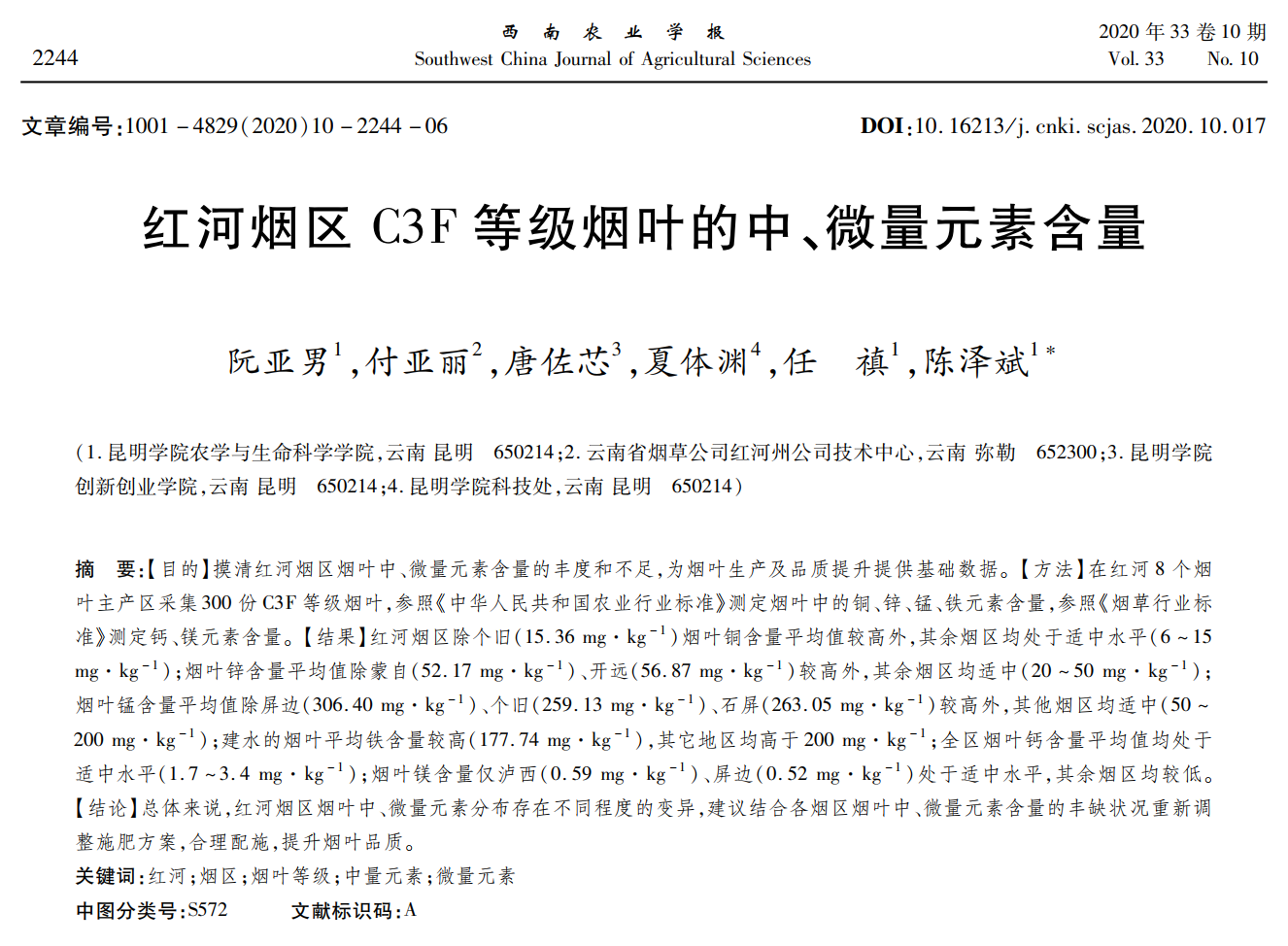 10月28日,农学与生命科学学院2019级硕士研究生阮亚男以第一作者身份在北大核心期刊、CSCD来源期刊《西南农业学报》2020年第10期上发表题名为“红河烟区C3F等级烟叶的中、微量元素含量”的研究论文。