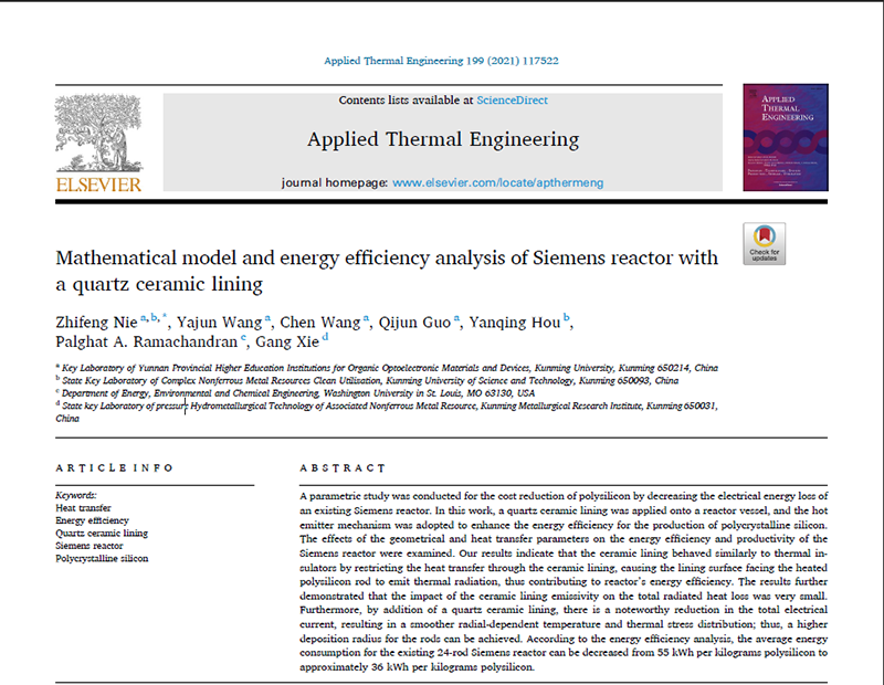 近日,yl23411永利集团官网科技处云南省高校有机光电子材料与器件重点实验室聂陟枫博士研究团队联合圣路易斯华盛顿大学Palghat A. Ramachandran教授、中铝首席研究员谢刚教授在西门子法多晶硅提质降耗领域取得重要进展,相关工作以题为Mathematical model and energy efficiency analysis of Siemens reactor with a quartz ceramic lining发表在国际著名学术期刊《Applied Thermal Engineering》,该期刊由著名学术出版商Elsevier公司发行,是能源、工程技术领域的Q1区SCI期刊,以原创性论文、综述、快讯等内容为主,影响因子5.295。yl23411永利集团官网为第一单位,聂陟枫博士为第一作者和通讯作者。