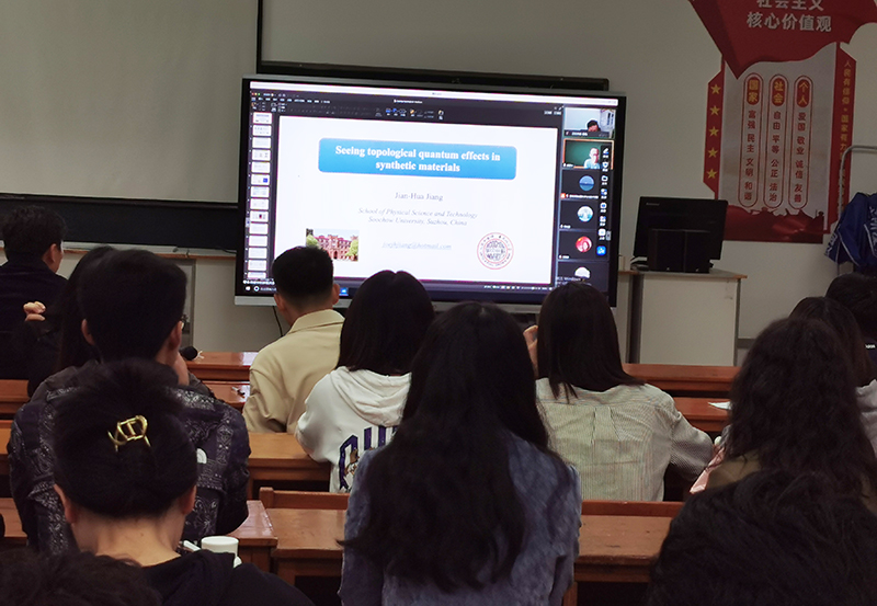 5月27日,苏州大学蒋建华教授应邀采用线上会议的形式为yl23411永利集团官网物理科学与技术学院作了题为“在合成材料中视听量子拓扑效应”的学术报告。报告由物科学院杨海教授主持,学院教师及硕士研究生在活动会议室聆听了本次报告。