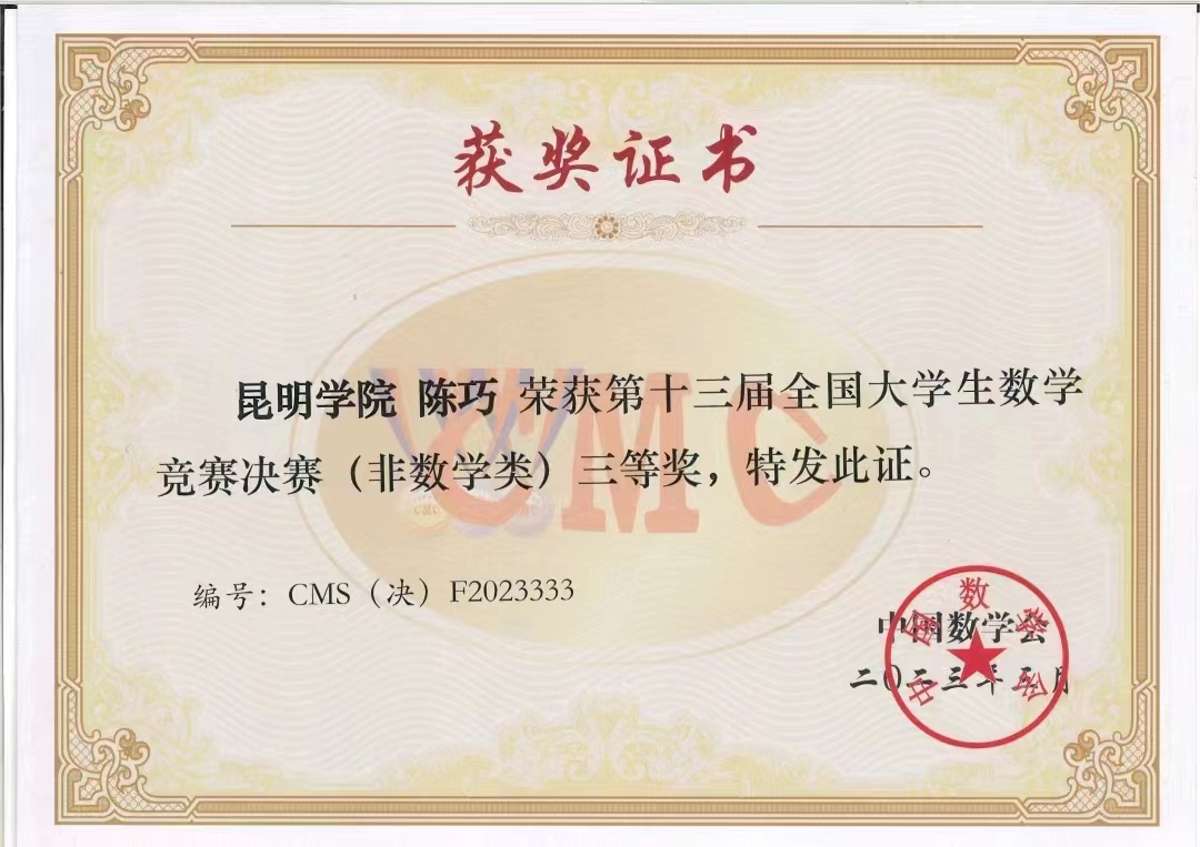 云南赛区有12名同学与包括北京大学、清华大学在内的高校学子同台竞技,通过激烈的角逐,yl23411永利集团官网数学学院学子陈巧荣获第十三届全国大学生数学竞赛决赛(非数学类)三等奖,实现了永利官网在本项赛事中获国家奖的突破。陈巧(女)同学是yl23411永利集团官网数学学院应用统计学专业2018级学生,现在重庆工商大学攻读硕士学位。