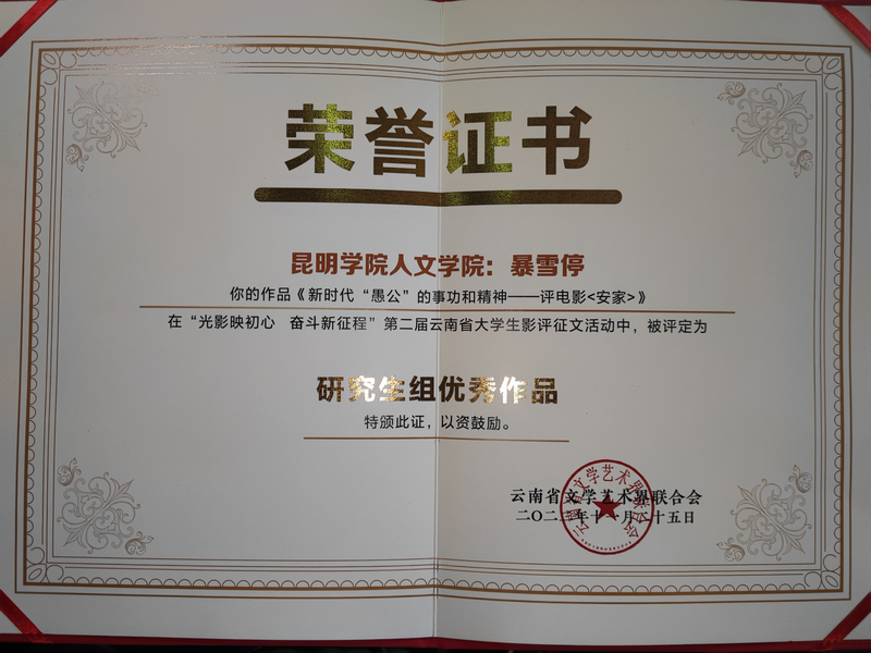 暴雪停同学为人文学院2020级中国少数民族语言文学方向在读硕士研究生。其获奖论文《新时代“愚公”的事功和精神——评电影〈安家〉》以电影《安家》为评论对象,指出易地搬迁是事功,也是精神。安家不仅同愚公移山一样,是一项艰难的事业,亦体现了主人公凝聚人心、转变观念的伟大功绩,及其大公无私、不畏艰险的家国情怀。