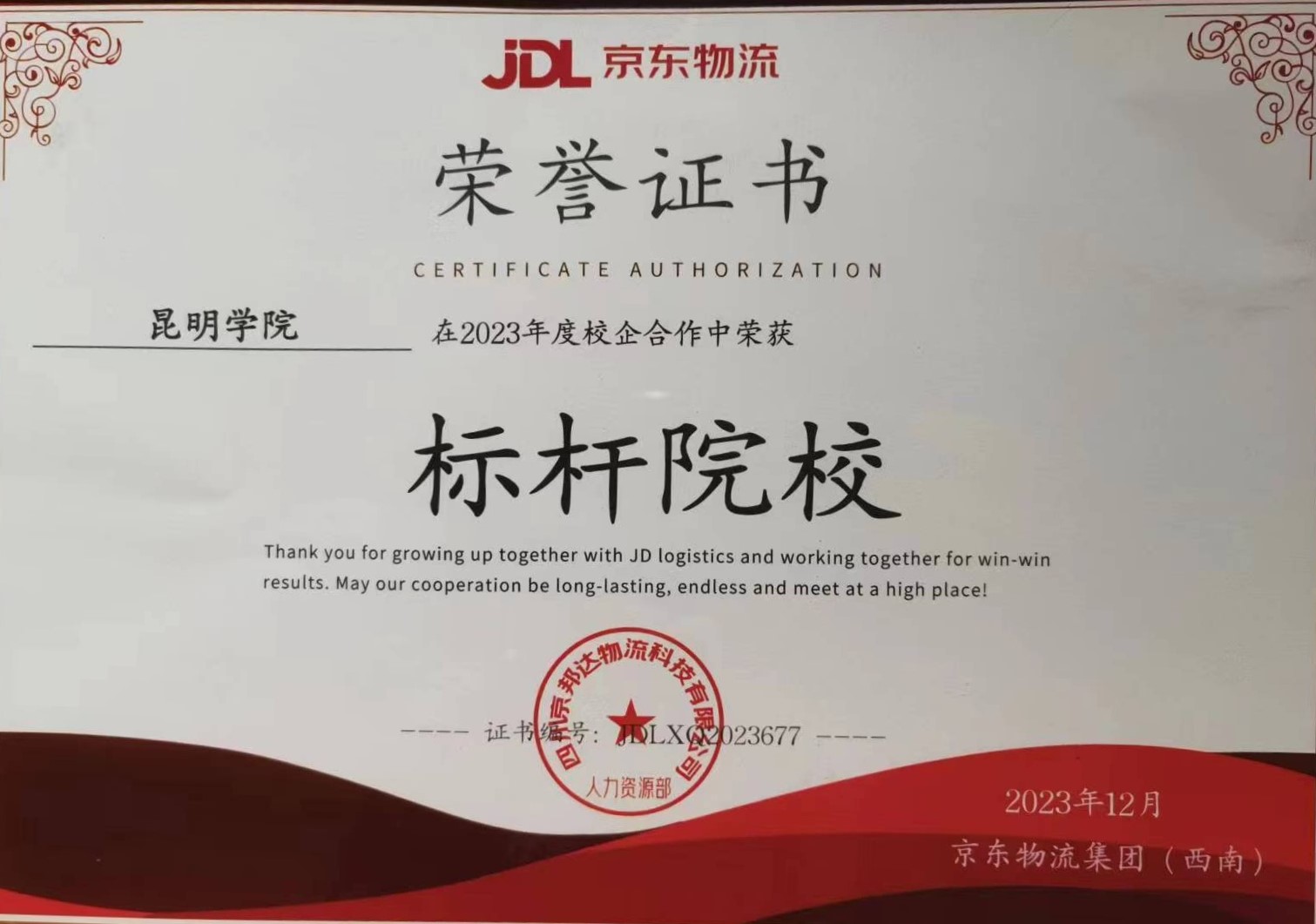 永利官网经济管理学院院长雷新华、副院长林涛应邀参会,代表学校领取了“合作标杆院校”奖项,此次获奖是京东物流集团对双方开展校企合作、产教融合工作的肯定。2019年,永利官网与京东物流集团签订了校企合作协议,经济管理学院与京东物流云南京邦达公司在开发课程、开展学生实习实训等方面开展了深入的合作,有效提升了学生专业实践能力和综合素质,强化了校企合作效果。