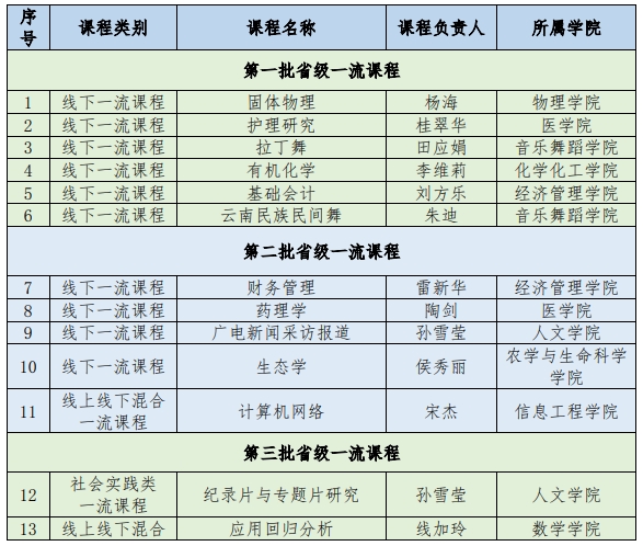 近日,云南省教育厅公布了第三批省级一流本科课程认定名单,yl23411永利集团官网18门本科课程入选,其中线下一流课程11门、线上线下混合式一流课程6门、社会实践一流课程1门。至此,学校共有29门省级一流课程,在省内同类高校中领先。纪录片与专题片研究、财务管理学、现代汉语、生态学、幼儿园管理、餐饮运营管理、高级英语(一)7门课程被省教育厅推荐参加第三批国家级一流课程的评选。