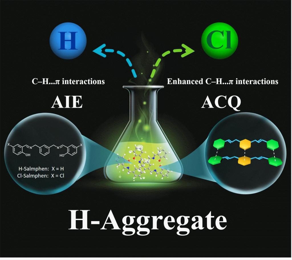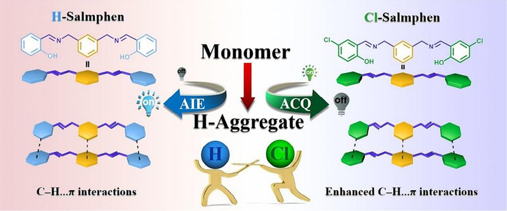 在最近的研究中,yl23411永利集团官网吴琼教授团队,成功合成了两种具有H-聚集特性的席夫碱化合物Cl-Salmphen和H-Salmphen。单晶结构分析表明,两个光谱学呈H-聚集体特征的分子之间并不存在π-π相互作用;相反,相邻分子之间主要通过C-H...π相互作用连接。这意味着C-H...π相互作用也可以诱导H-聚集体的产生。更有趣的是,尽管卤素原子的引入并没有改变分子间的相互作用类型和堆积模式,但其荧光行为发生了从聚集诱导荧光增强(AIE)到聚集荧光猝灭(ACQ)的转变根本转变,理论计算表明这与卤原子的引入增强了分子间相互作用有关(图1)。性质研究表明,这种独特的相互作用模式在形成了超高光学信噪比的同时还有效的拓展了探针在有机物中水含量检测范围。此外团队利用这一特点,制作了一个高效的荧光试纸传感器,并借助手机实现了有机溶剂中含水量的快速、准确的实时检测。这项工作为H-聚集体的形成机制和新型光学器件的拓展提供了一个崭新的视角。