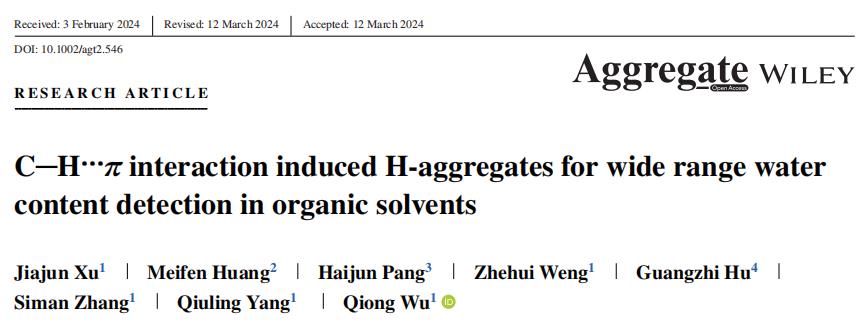 近日,永利官网化学化工学院吴琼教授团队在光学材料领域取得新进展,相关工作以题为“C-H...π interaction induced H-aggregates for wide range water content detection in organic solvents”的文章发表在顶级期刊《Aggregate》(doi.org/10.1002/agt2.546)上(中科院一区,影响因子: 18.8),实现了永利官网在国产顶级学术期刊的突破。永利官网化学化工学院2021级研究生许家俊为第一作者,化学化工学院吴琼教授为通讯作者。
