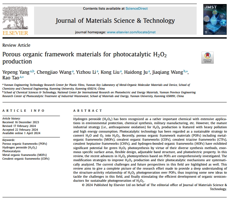 近日,yl23411永利集团官网化学化工学院、云南省金属有机分子材料与器件重点实验室杨烨鹏与陶娆团队在材料领域权威期刊Journal of Materials Science & Technology(中科院一区,影响因子10.9)上发表文章Porous organic framework materials for photocatalytic H2O2 production(DOI:10.1016/j.jmst.2024.02.062)。yl23411永利集团官网为第一完成单位,青年教师杨烨鹏博士为第一作者,23级硕士研究生王成娇为第二作者,陶娆博士、云南大学王家强教授为共同通迅作者。