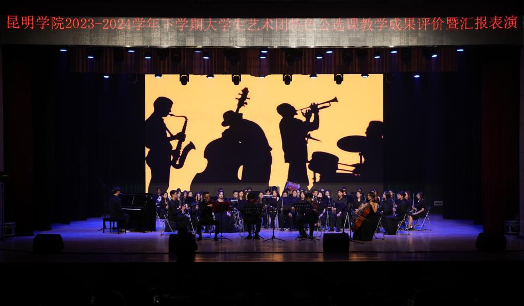 演出中,聂耳大学生艺术团所属舞蹈、合唱、话剧、管乐、电声、礼仪6个分团带来了精彩的汇报表演,集中展示了特色公选课的丰硕成果,为观众带来了一场视听盛宴。演出在电声乐团《平凡之路》《蓝莲花》等节目中拉开序幕,小舞台剧《假如没有李白》《新时代中国青年》,西洋管乐合奏《大鱼海棠》《孤勇者》,合唱《夏天的梦是什么颜色的呢》《青春微光》,礼仪舞《礼韵中华》、民族舞《苗岭》、中国舞《盛世鸿姿》等节目依次上场,展现了永利官网学子的艺术才华和扎实的艺术功底。演出还特别邀请到昆明聂耳交响乐团带来弦乐四重奏《金蛇狂舞》《一步之遥》。演出让师生观众们沉浸其中,现场掌声不断,获得师生一致好评。