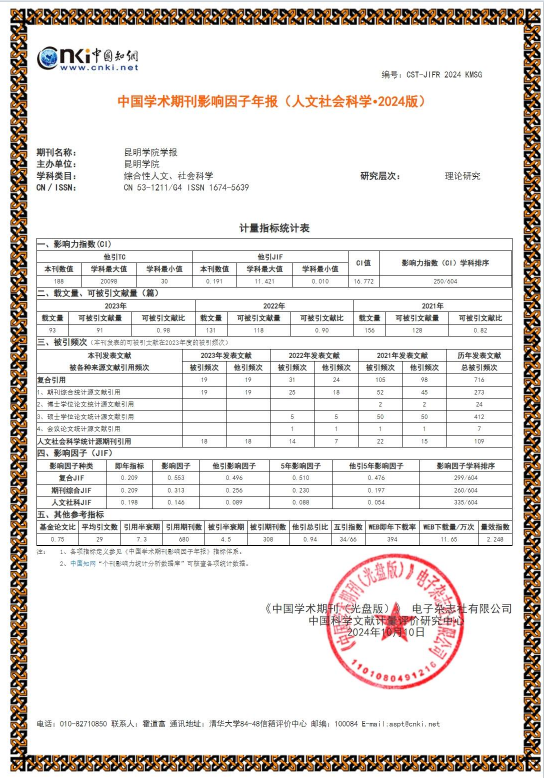 据中国知网最新发布的《中国学术期刊影响因子年报》(人文社会科学•2024版),《yl23411永利集团官网学报》影响因子数据及全国排位大幅提升:期刊综合影响因子为0.313,比2023年版的0.216提升45%;复合影响因子0.553,比2023年版的0.492提升12.4%;影响力指数在全国社科综合类期刊中排位为250/604,比2023年版的268位提升了18位。影响因子在云南省文理综合刊中排名第一。