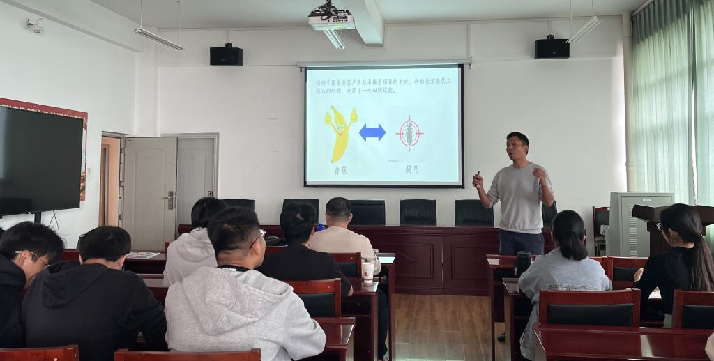 报告会上,尹可锁副研究员以香蕉蓟马防控为讲座切入点,结合蓟马在香蕉花蕾期的发生动态、为害症状和分布特征,探讨香蕉蓟马精准防控技术,研究结果为后期绿色防控产品研发和应用奠定基础。尹可锁副研究员的讲解深入浅出,逻辑严密,得到了在场师生的一致好评。会后,学院师生与尹可锁副研究员对蓟马防控技术进行了交流讨论。本次讲座的开展为学院师生在植物病虫害防控领域的研究提供了新的思路和启示。