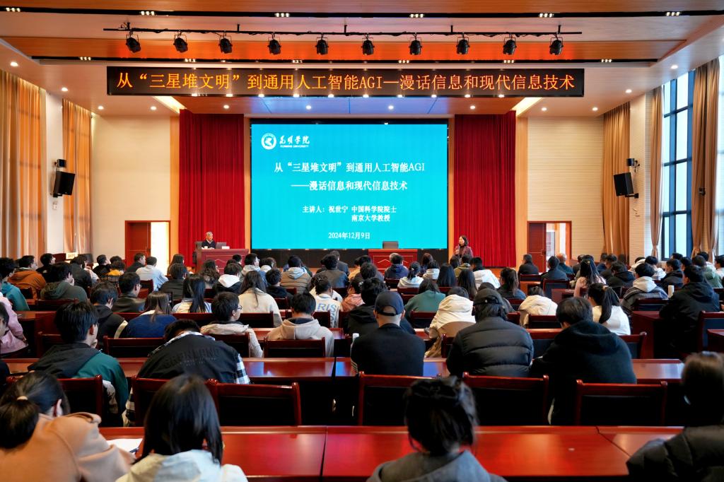 12月9日,中国科学院院士、南京大学祝世宁教授受邀到校为师生作了题为“从‘三星堆文明’到通用人工智能AGI— 漫话信息和现代信息技术”的报告。报告会由学校党委副书记、校长丁文丽主持,党委委员、副校长王凡、李剀,学校人事处、教务处、科技处、对外合作与交流处、研究生部等职能部门负责人、全校师生共300余名现场聆听了报告。