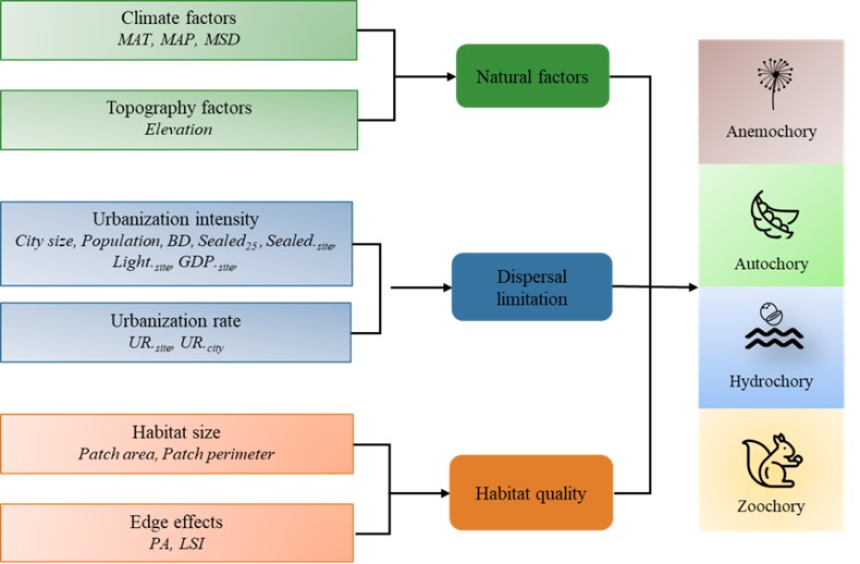 扩散在物种形成以及群落构建和维持等过程中扮演重要作用,是影响物种分布关键因子之一。城市是一个高度复杂的生态系统,影响物种在城市中扩散的环境因子(外因)也错综复杂。物种能否成功扩散到一个新的生境中,除受到环境因子影响外,还受自身扩散能力(内因)的影响。自生植物作为城市生物多样性的重要组成部分,是城市化的指示种组,但不同种子传播方式的自生植物丰富度在城市环境梯度上的分异格局及其成因依旧缺乏全面的认知。据此,本研究以云南省16个地级市为对象,调查了城市绿地斑块中的自生维管束植物,分析了不同种子传播方式的自生植物物种丰富度的影响因素及其敏感性差异。