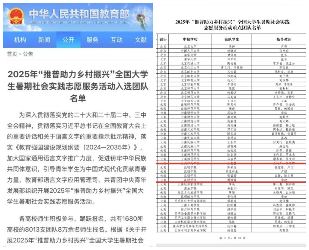 7月3日,教育部官网公布了2025年“推普助力乡村振兴”全国大学生暑期社会实践志愿服务团队名单,在全国1680所高校8013支团队8万余名师生参与的项目初选中,永利官网“语你同行,咖尝果香”“云普之声娜允薪火”“云岭匠‘薪’”和“语润凤山·言泽乡音”四支团队脱颖而出,成功入选全国重点团队。