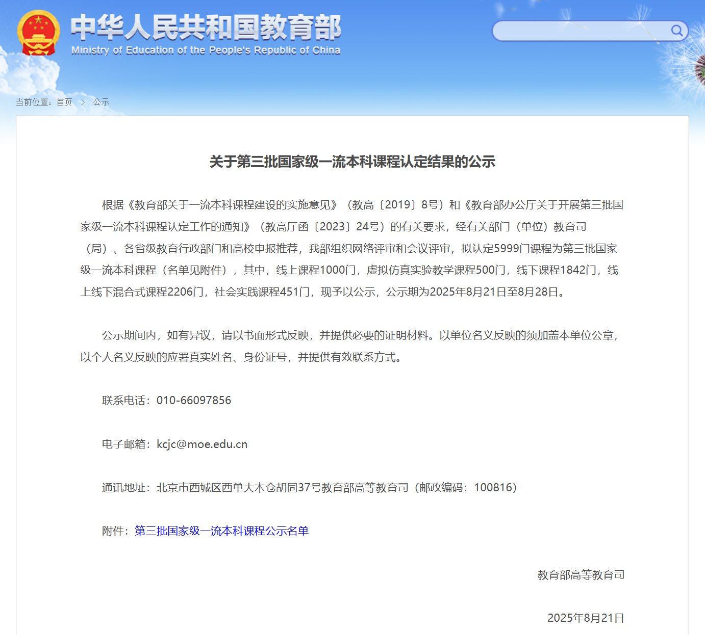 8月22日,教育部网站发布《关于第三批国家级一流本科课程认定结果的公示》,永利官网4门课程成功入选,分别为:学特学院高春玲教授《幼儿园管理》、旅游学院田芙蓉教授《餐饮运营管理》、农生学院侯秀丽教授《生态学》、人文学院孙雪莹副教授《纪录片与专题片研究》。这是学校首次获批国家级一流课程,是在课程建设中取得的重大突破。