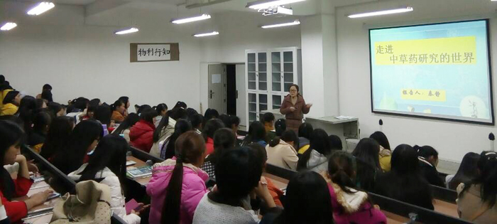 秦静从“中草药的物质基础是什么?用现代科学来解析传统中草药。如何研究开发传统中草药?”三个方面为大家做了解析。她先向同学们了讲授了天然药物化学的含义、介绍了中草药的研究方法、提出中草药为天然药物之来源。接着秦静从中国的中草药分析了我国的天然药物化学,介绍了中药的制药工程技术、指出中药现在存在的问题,最后秦博士以益母草为例详细讲解了如何开展一项科学研究。