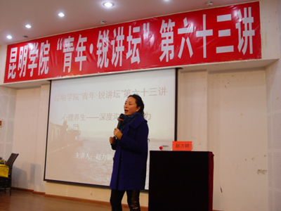 10月24日晚,由校团委主办的“青年•锐讲坛”第六十三讲“心理养生——深度沟通的魅力”在青年中心学生报告厅成功举办。本场讲座邀请到了云南省演讲学会常务理事、国家二级企业培训师、国家二级心理咨询师、AA级沙盘治疗师、国际注册催眠师赵力颖老师担任主讲人。